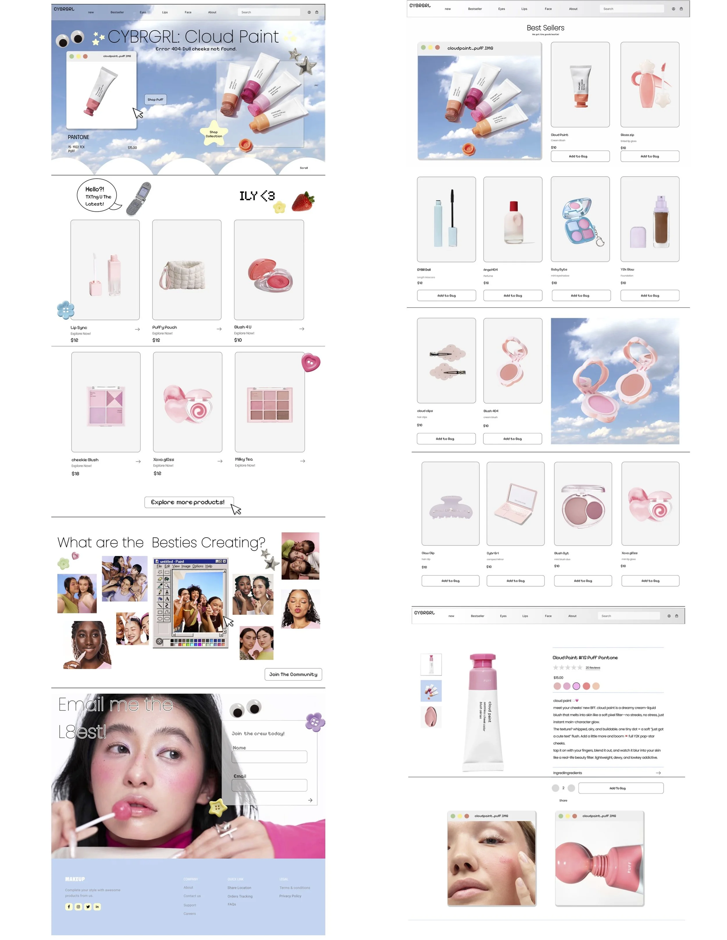 The visual branding blends early-internet UI aesthetics with playful, pastel cosmetics creating a brand that feels cute, interactive, and slightly ironic. My target audience being Gen Z as well as Gen Alpha that is into soft glam, internet culture and nostalgia. The color palette is light and airy with sky blues, baby pinks, and creamy whites and light grays that help with the UI base aesthetic. In choosing these colors my goal was to create a dreamy cloud like softness to the website while still feeling playful and youthful, nothing too luxe so that the brand is more approachable and fun especially for a younger audience. Typography is a mix between a modern sans- serif and a pixel UI font. This creates a fun contrast between a structured minimal e-commerce UI and a chaotic cute personality driven text. I wanted to do this to mirror early internet design like AIM, or desktop interfaces. For the layout I wanted it to be clean and the typical e-commerce setup with intentional "interruptions". The floating windows that resemble desktop image previews or a literal MS paint style interface, and overlapping elements like stickers, buttons, and fruits gives the website a digital scrapbook vibe, not just a store. What makes the branding stand out is the UI concept—the “fake desktop / pop-up window” approach gives it a strong, ownable identity.