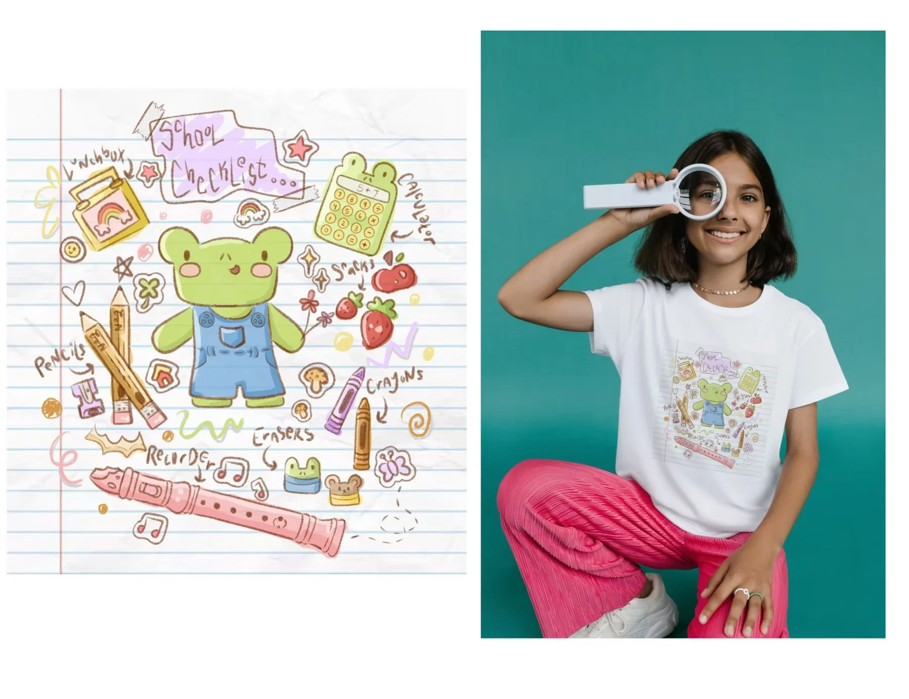 Back to School never looked so cute! All the class essentials that goes into Frogys backpack! The style is very colorful and mimics a drawing on a spiral notebook page.